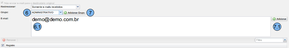 Escolha o grupo (6) ou a conta (6.1) para onde os e-mails serão redirecionados e clique em “Adicionar Grupo” (7) ou “Adicionar” (7.1).