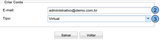 Em “E-mail” de um nome para a conta (2) e em “Tipo” selecione “Virtual” (3), para finalizar clique em “Salvar”.